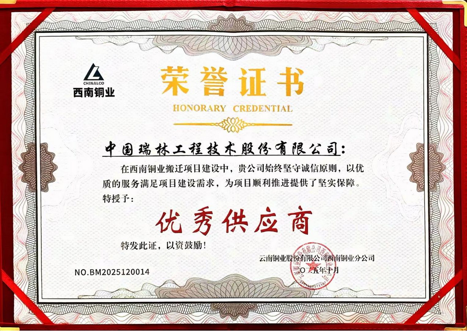 中国瑞林获评云南铜业西南铜业搬迁项目“优秀供应商”