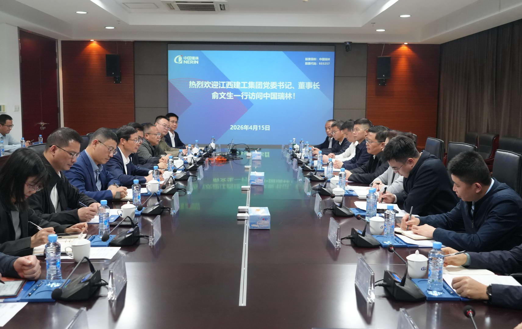 2026年4月15日,中国瑞林工程技术股份有限公司(以下简称“中国瑞林”)与江西省建工集团有限责任公司(以下简称“江西建工集团”)战略合作签约仪式在南昌举行。中国瑞林党委书记、董事长、总经理吴润华,江西建工集团党委书记、董事长俞文生出席活动并共同见证签约。中国瑞林党委委员、副总经理刘奕,江西建工集团副总经理谌丰毅代表双方签约。中国瑞林法务总监韩朕、江西建工集团副总经理练红梅及双方相关部门负责人出席签约仪式。