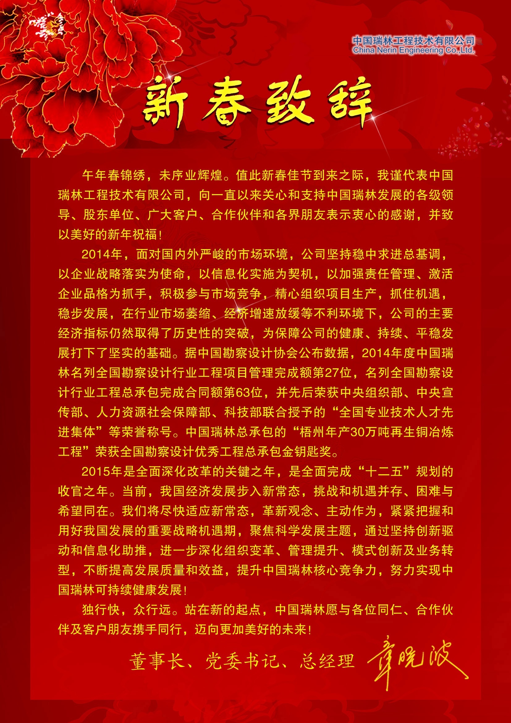 午年春锦绣,未序业辉煌。值此新春佳节到来之际,我谨代表中国瑞林工程技术有限公司,向一直以来关心和支持中国瑞林发展的各级领导、股东单位、广大客户、合作伙伴和各界朋友表示衷心的感谢,并致以美好的新年祝福!