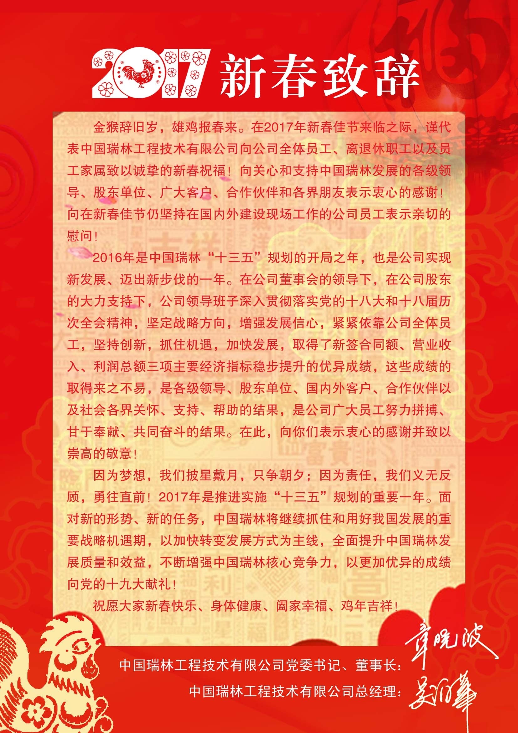 金猴辞旧岁,雄鸡报春来。在2017年新春佳节来临之际,谨代表中国瑞林工程技术有限公司向公司全体员工、离退休职工以及员工家属致以诚挚的新春祝福!向关心和支持中国瑞林发展的各级领导、股东单位、广大客户、合作伙伴和各界朋友表示衷心的感谢!向在新春佳节仍坚持在国内外建设现场工作的公司员工表示亲切的慰问!